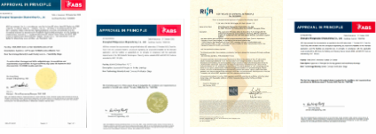 從左至右依次為21萬噸紐卡斯?fàn)栃图状既剂蟿恿ι⒇洿?200車雙燃料動力汽車運(yùn)輸船(PCTC)、創(chuàng)新型30萬噸原油輪(VLCC)、115萬載重噸氨燃料油輪的AIP證書
