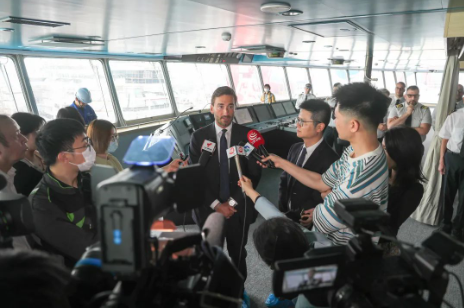 船東在MOBY豪華客滾船1號(hào)船啟航儀式上接受媒體采訪