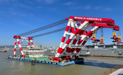 澳氹第四條跨海大橋鋼梁吊裝任務(wù)由“鐵建大橋起1”號起重船完成。該船由中國船舶集團(tuán)七〇八所研發(fā)設(shè)計(jì),一期“L”型起重臂架為澳氹四橋工程專屬設(shè)計(jì)和打造,具有完全自主知識產(chǎn)權(quán)。