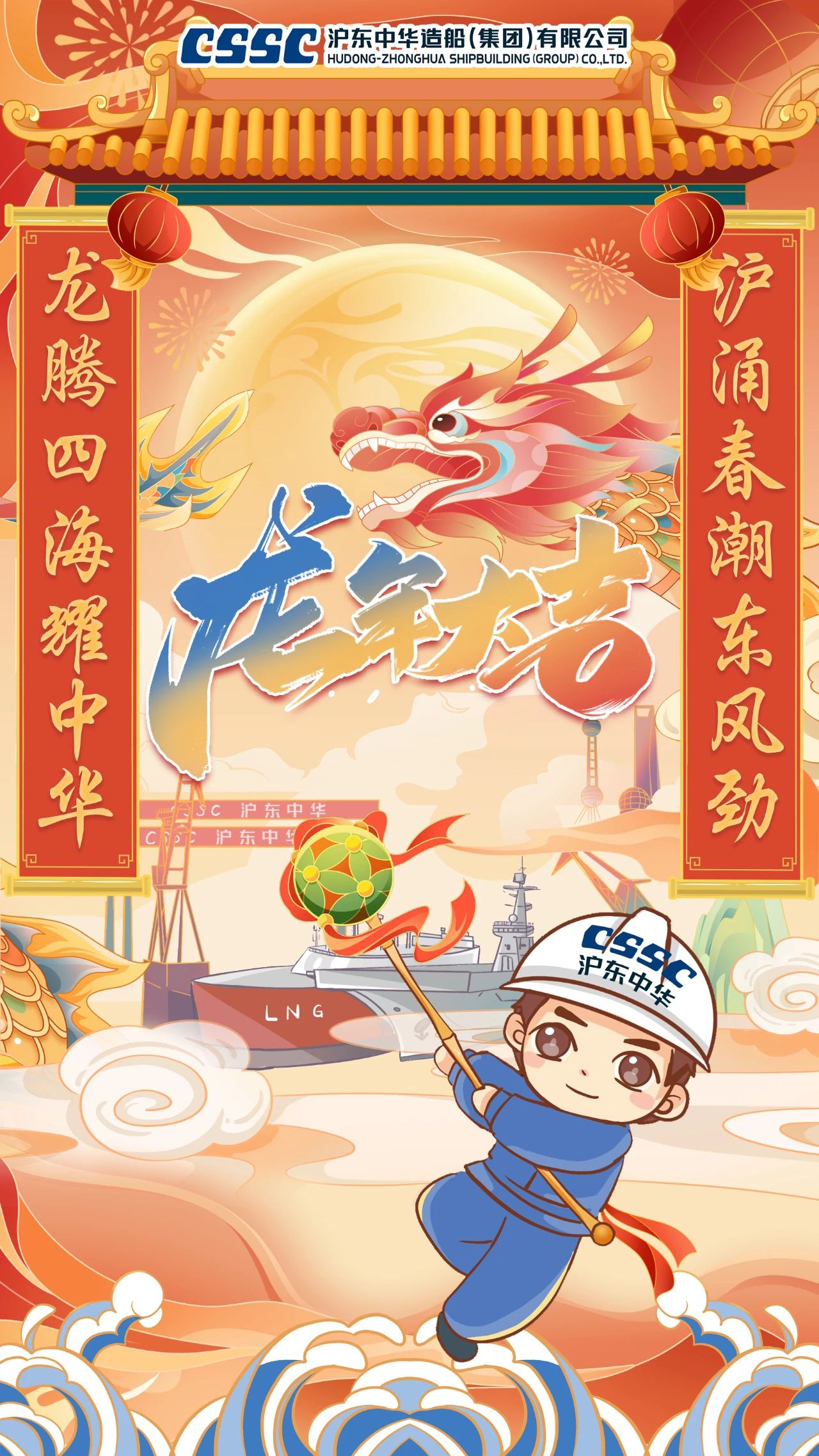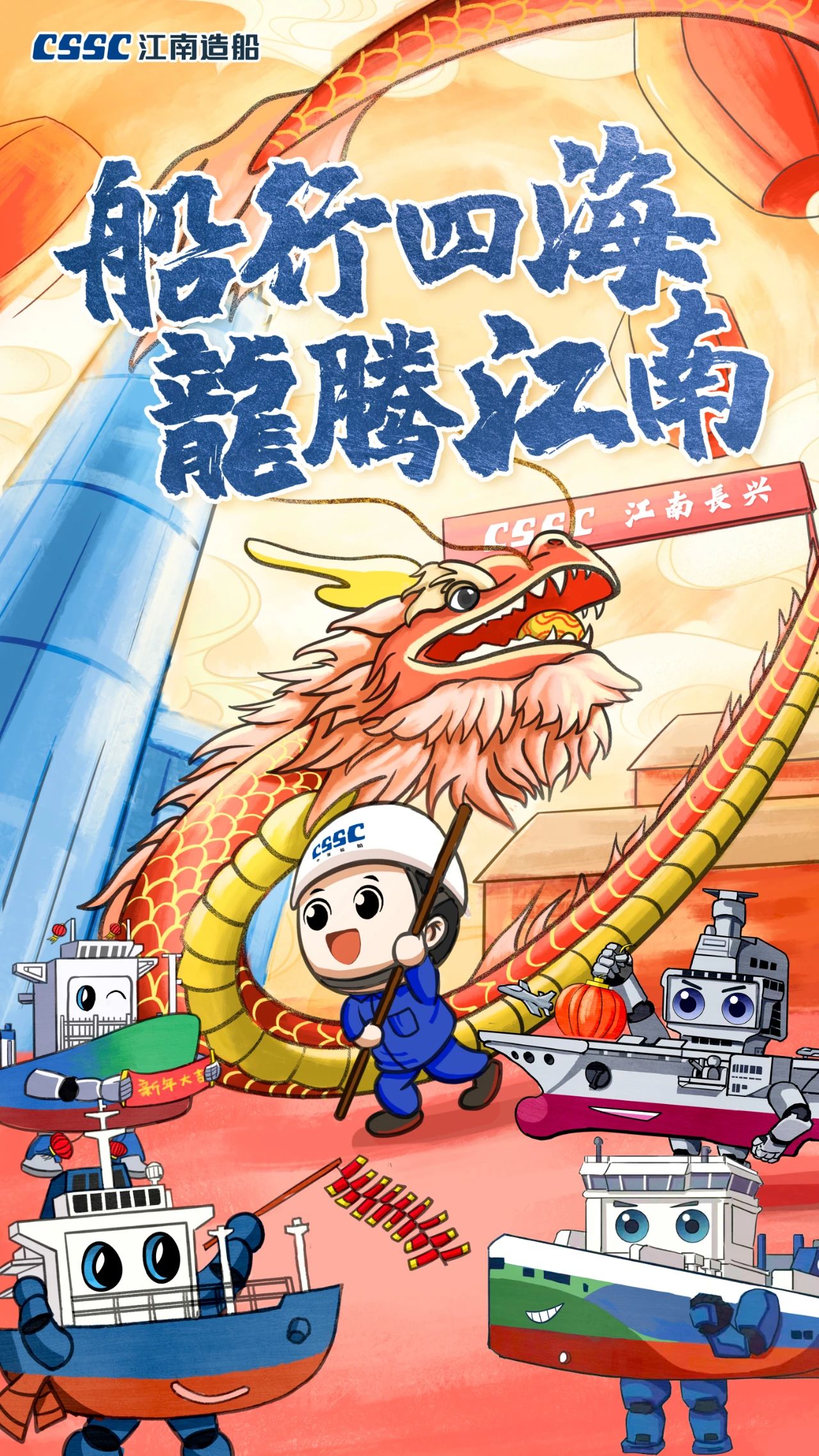 創(chuàng)意說明:海報(bào)中“江小南”舞起龍頭,預(yù)示著在新的一年,江南造船將賡續(xù)努力,龍頭揚(yáng)起、再創(chuàng)新績!而跟隨舞動(dòng)的則是目前江南造船在建的集裝箱船、液化氣船和汽車滾裝船等主產(chǎn)品系列。