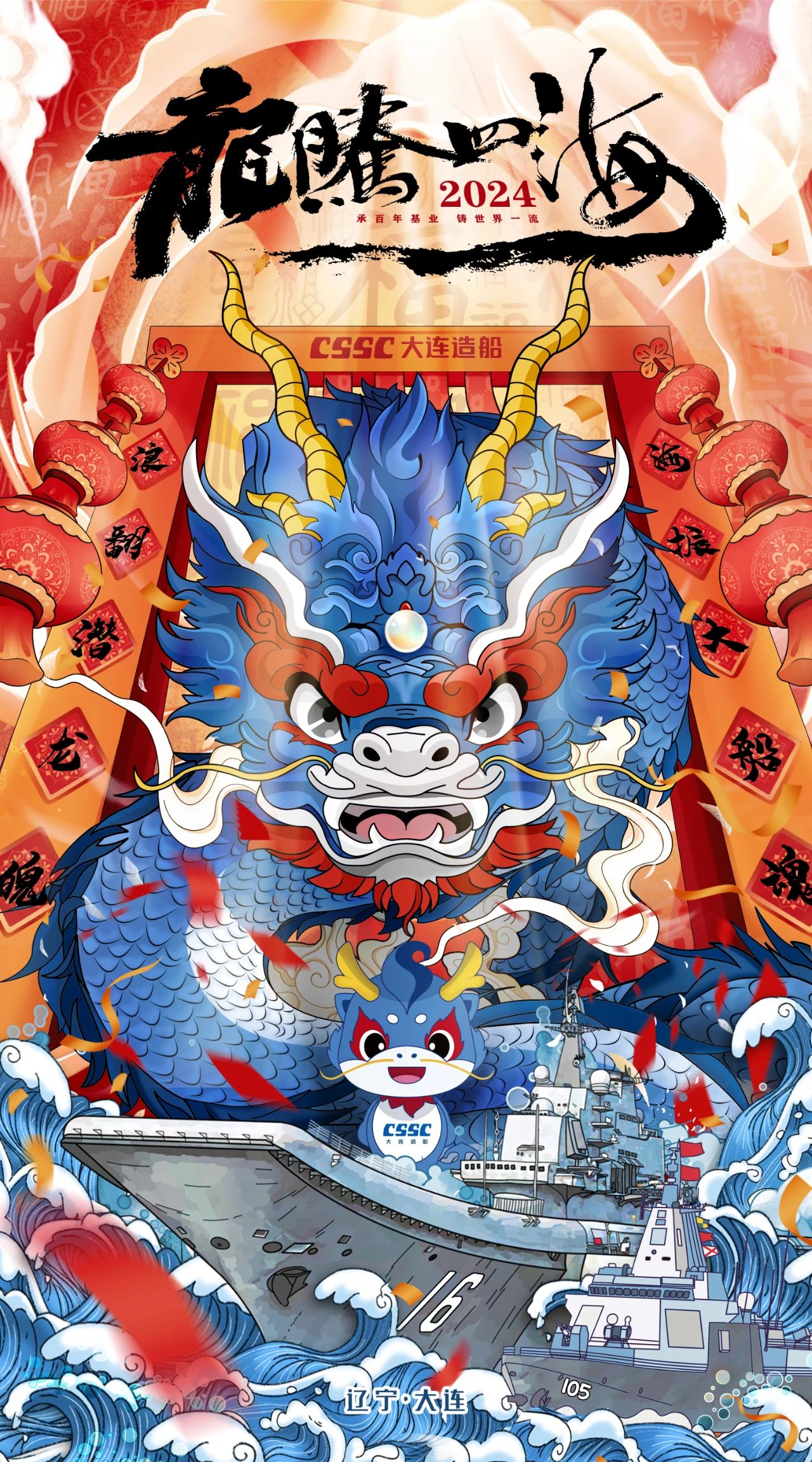 創(chuàng)意說明:采用國潮手繪風(fēng)格,將中國傳統(tǒng)文化元素和大連造船遼寧艦、大連艦等企業(yè)特色相結(jié)合,以彰顯造船龍頭企業(yè)的榮耀和奮發(fā)向上的精神。整體設(shè)計(jì)采用上中下三個(gè)部分的排列方式,比例為1:2:1。