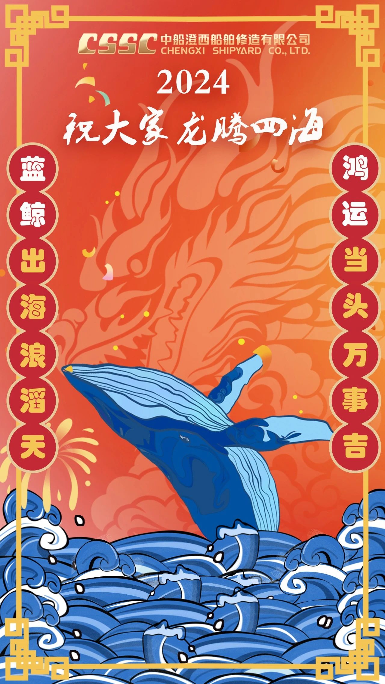 創(chuàng)意說明:海報(bào)以龍年為主題,主體為藍(lán)鯨。自研8萬噸級(jí)散貨船“藍(lán)鯨”系列和5萬噸級(jí)油化船“鴻運(yùn)”系列是中船澄西命名的品牌船型,凝結(jié)了公司全員智慧。