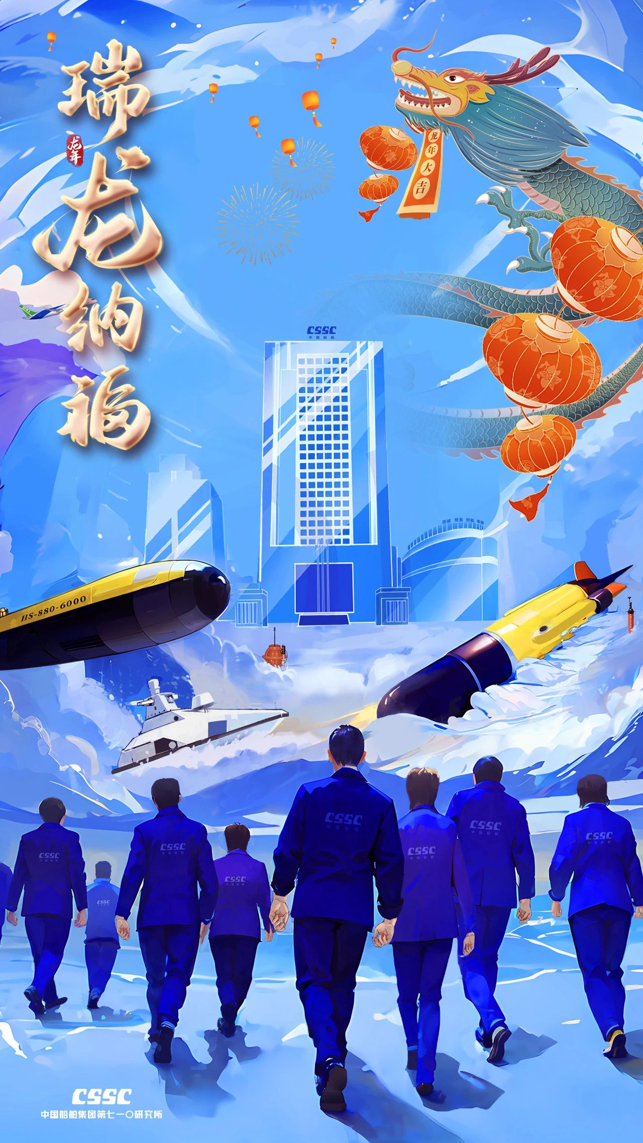 創(chuàng)意說明:海報(bào)以七一〇所科研大樓為畫面背景,以特色產(chǎn)品為主要元素,以科研人員奔赴向前的身影為主角,點(diǎn)綴以五彩龍、孔明燈、彩燈等中國傳統(tǒng)春節(jié)元素,傳達(dá)出全體員工立志“興裝強(qiáng)軍 科技報(bào)國”的嶄新姿態(tài)。