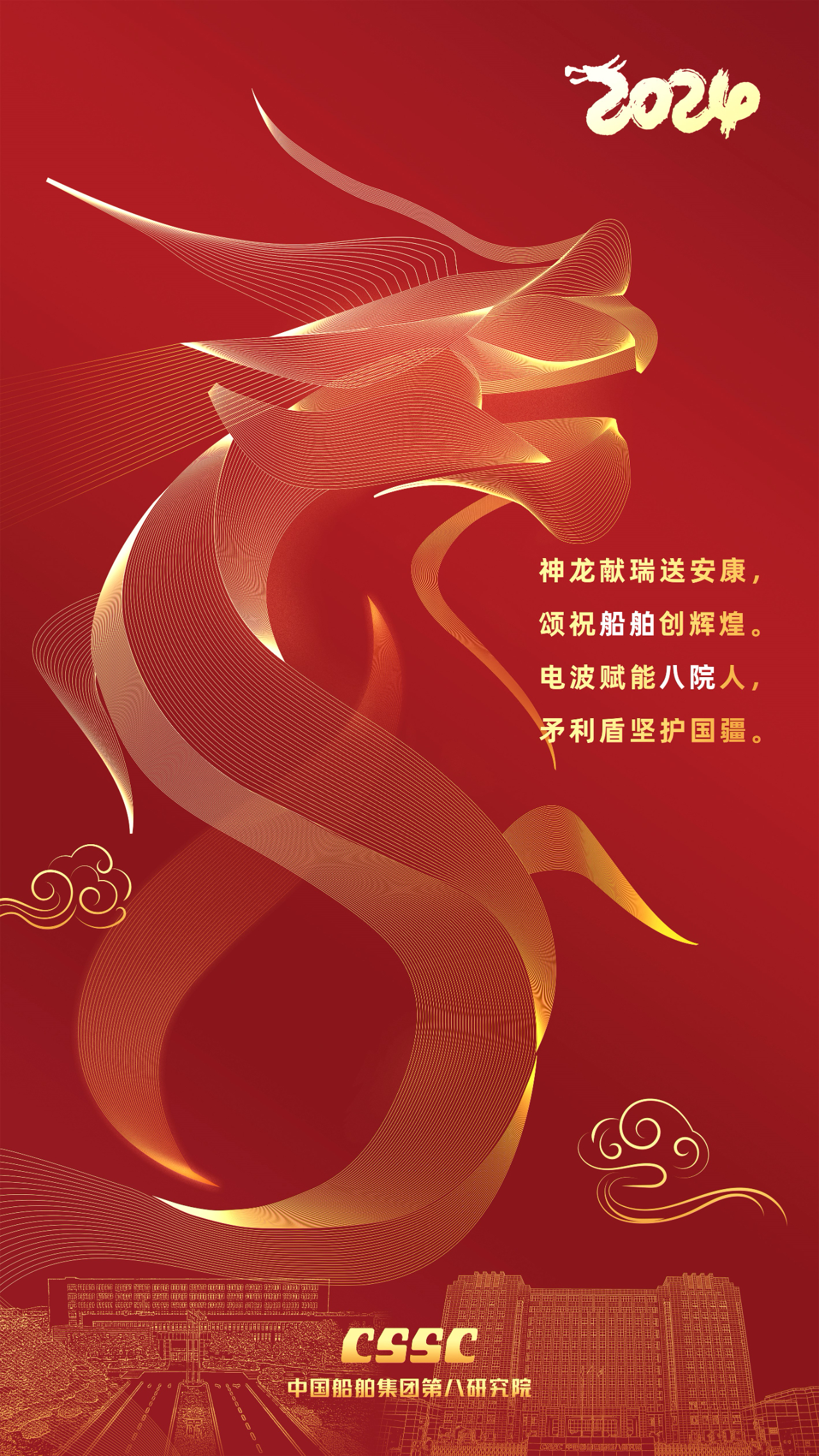 創(chuàng)意說明:海報(bào)中龍的花紋是電磁波圖形,體現(xiàn)八院的專業(yè)特色;龍的整體造型為8字型,意為八院;兩院區(qū)主樓上空飄祥云,寓意祥龍送喜,福照八院!