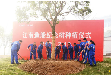 江南造船2023年度先進、勞模代表共同植下了2023年紀念樹。江南造船每年會在開工第一天種下上一年度的紀念樹,這是江南造船上島以來種下的第17棵年代樹。