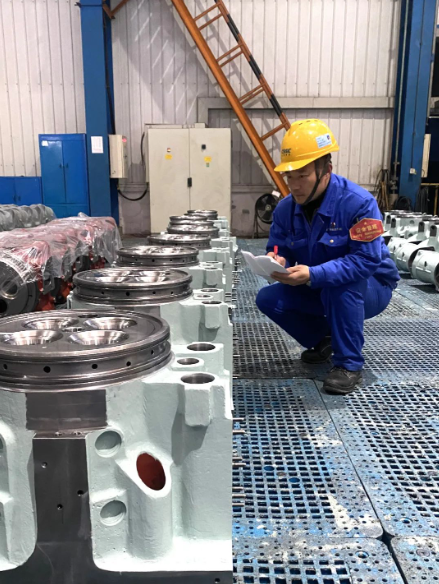 在中船鎮(zhèn)柴廠區(qū)北側(cè)的試驗車間內(nèi),多臺已經(jīng)完成裝配的大缸徑中速柴油機正在進行緊張調(diào)試,宛若一件件藝術(shù)品接受最后的雕琢,等待交付。臺位上的工人們使出了“繡花功夫”嚴(yán)摳細(xì)節(jié),保證每道流程“零”瑕疵,確保檢驗一次通過。中船鎮(zhèn)柴技術(shù)中心的徐文正在為5號試車臺位上的9L32/40中速機做技術(shù)指導(dǎo)。他告訴記者,目前,試驗車間7個大臺位、12個小臺位,共計19個中速機試車臺位滿負(fù)荷運轉(zhuǎn)。為中國船舶集團滬東中華24000TEU集裝箱船配套的9L32/40中速機正在進行磨合調(diào)試、為江蘇韓通贏吉重工有限公司3600噸起重船配套的9L32/40中速機正在做SCR(除氮裝置)后處理排放試驗;一臺18V32/40海外電站項目已完成交驗整裝待發(fā)、幾臺主機都在做最后的試驗,確保按期保質(zhì)全部發(fā)運交付。
