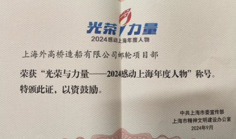 “光榮與力量——2024感動上海年度人物推選活動”獲獎名單日前揭曉。中國船舶集團(tuán)外高橋造船郵輪項目部獲評“2024感動上海年度人物”。本次活動以2023年8月至2024年7月中,上海市涌現(xiàn)的事跡突出、精神可嘉、社會認(rèn)可的模范人物和先進(jìn)集體為推選對象,通過175萬市民網(wǎng)絡(luò)投票和專家評審?fù)七x出先進(jìn)典型。
