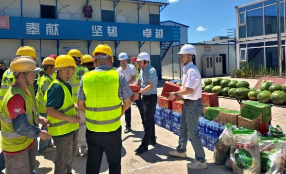 中船國際工程在項目現(xiàn)場開展綜合檢查工作,并向堅守崗位的項目員工及勞務(wù)隊伍送上防暑降溫物資,叮囑大家要科學(xué)合理安排作業(yè)時間,切實做好防暑降溫措施。