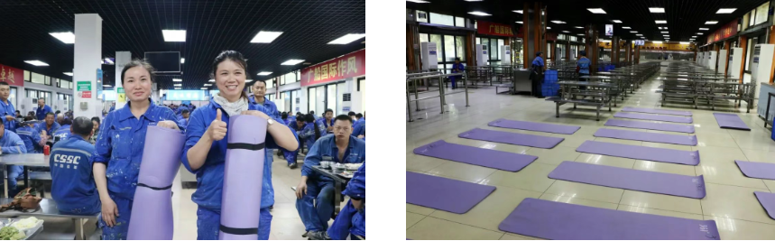 中午時分,走進(jìn)廣船國際生產(chǎn)指揮樓食堂,十幾臺空調(diào)已經(jīng)提前開啟,食堂內(nèi)涼爽舒適。據(jù)介紹,該公司已經(jīng)將會議室、食堂等公共區(qū)域開放給一線員工作為午間的“休憩港灣”,讓一線員工得以安心小憩、恢復(fù)體力。13個食堂內(nèi),除了不銹鋼凳子、桌子可以供員工躺下休息之外,還為員工準(zhǔn)備了瑜伽墊。