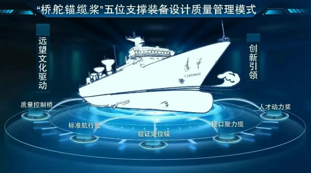 基于“全自主研發(fā)”和“巨系統(tǒng)抓總”的問題導(dǎo)向,七〇八所“遠(yuǎn)望”研發(fā)創(chuàng)新團(tuán)隊(duì)凝聚智慧和力量,以創(chuàng)新為引領(lǐng)、以遠(yuǎn)望文化為驅(qū)動,提煉了“橋、舵、錨、纜、槳”五位支撐裝備設(shè)計(jì)質(zhì)量管理模式。各項(xiàng)核心管理要素相互作用、五位支撐裝備研發(fā)設(shè)計(jì)過程,構(gòu)建形成了一個(gè)良好向上、持續(xù)提升的團(tuán)隊(duì)質(zhì)量管理機(jī)制,為確保裝備研制質(zhì)量奠定了堅(jiān)實(shí)基礎(chǔ)。“橋”是“艦橋”的簡稱,是艦船駕駛控制、觀察及決策的主要設(shè)施,其作用如同質(zhì)量控制。“舵”是控制艦船航行方向的主要設(shè)備,其作用如同規(guī)范指引?!板^”作為艦船停泊和定位的主要設(shè)備,其作用如同試驗(yàn)驗(yàn)證?!袄|”作為艦船靠幫連接的主要設(shè)備,其作用如同接口管理?!皹笔翘峁┡灤叫袆恿Φ闹饕O(shè)備,其作用如同人才保障。