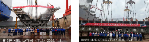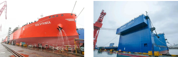 1月31日,外高橋造船建造的15.8萬(wàn)噸蘇伊士型原油船H1589船及7000TEU集裝箱船H1656船順利下塢。