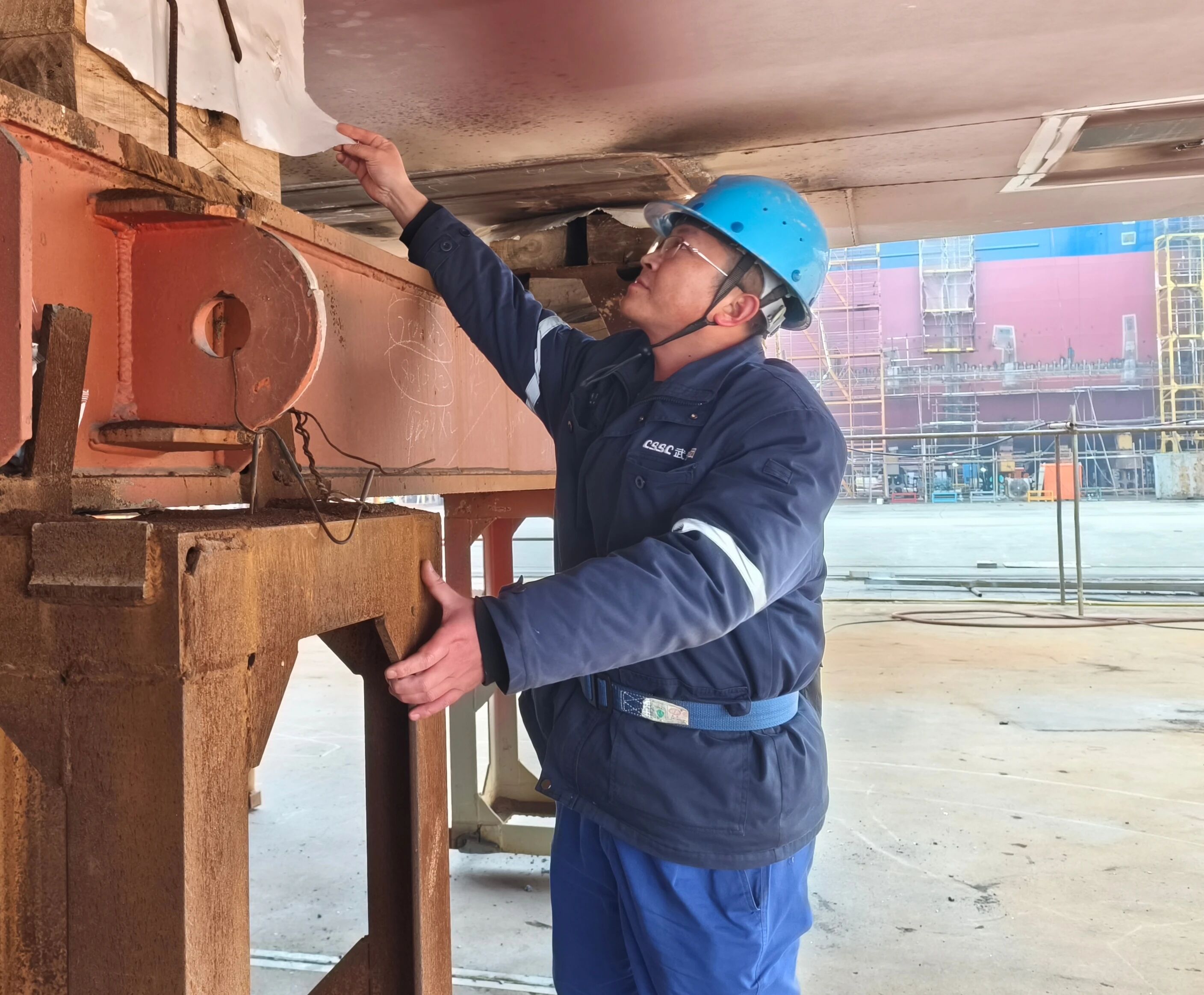 正在進(jìn)行例行巡檢的船舶總裝部船臺車間生產(chǎn)調(diào)度員楊華,突然發(fā)現(xiàn)船臺現(xiàn)場的一座門架出了問題。