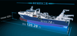 ????“深藍號”由黃埔文沖建造,七〇八所參與設(shè)計,總長約120米,型寬21.6米,設(shè)計吃水7.3米,設(shè)計航速15節(jié),主機功率8000 千瓦,載重噸約5000噸。“深藍號”是我國自主研制建造的第一艘漁業(yè)捕撈加工一體船,也是目前最大最先進的漁業(yè)捕撈加工一體船,取得近200項知識產(chǎn)權(quán)保護,實現(xiàn)了我國現(xiàn)代化漁業(yè)船舶裝備領(lǐng)域的重大突破,達到世界先進水平;主要用于南大洋漁業(yè)捕撈,兼顧海洋科考功能,可滿足ICE-A冰區(qū)(冰厚度0.8米)及-25℃低溫環(huán)境的營運要求。