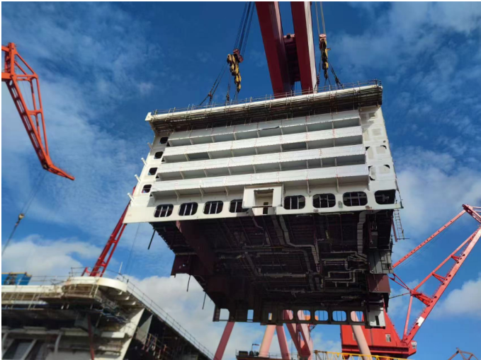 7月28日,第二艘國產(chǎn)大型郵輪首個帶陽臺的總段完成搭載。