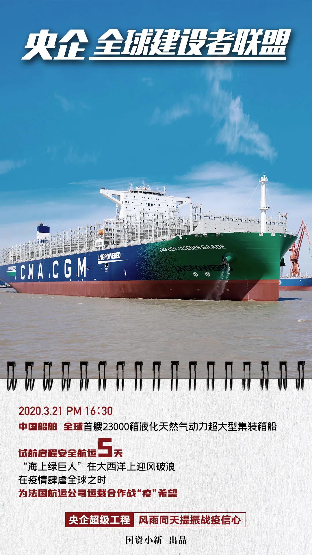 ????今天,國(guó)資小新發(fā)布圖文消息《央企全球建設(shè)者聯(lián)盟:風(fēng)雨同天提振國(guó)際合作戰(zhàn)疫信心!》。開篇提到中國(guó)船舶集團(tuán)所屬滬東中華建造的全球首艘23000箱液化天然氣(LNG)動(dòng)力集裝箱船開啟常規(guī)試航之旅,在疫情肆虐全球之時(shí),為法國(guó)航運(yùn)公司運(yùn)載合作戰(zhàn)“疫”希望。