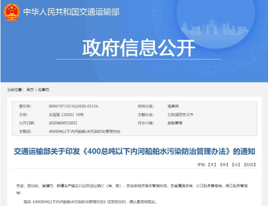 該《辦法》共包含七個(gè)章節(jié),旨在防治內(nèi)河船舶污染水域環(huán)境,涉及“生活污水污染防治”“船舶垃圾污染防治”“機(jī)器處所油污水污染防治”“洗艙水污染防治”等內(nèi)容。