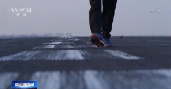 總臺央視記者 李寧:我現(xiàn)在是在海軍艦載航空兵某部,現(xiàn)在已經(jīng)有戰(zhàn)斗機(jī)進(jìn)入飛行甲板,這個(gè)甲板是按照航母1:1來建造的。