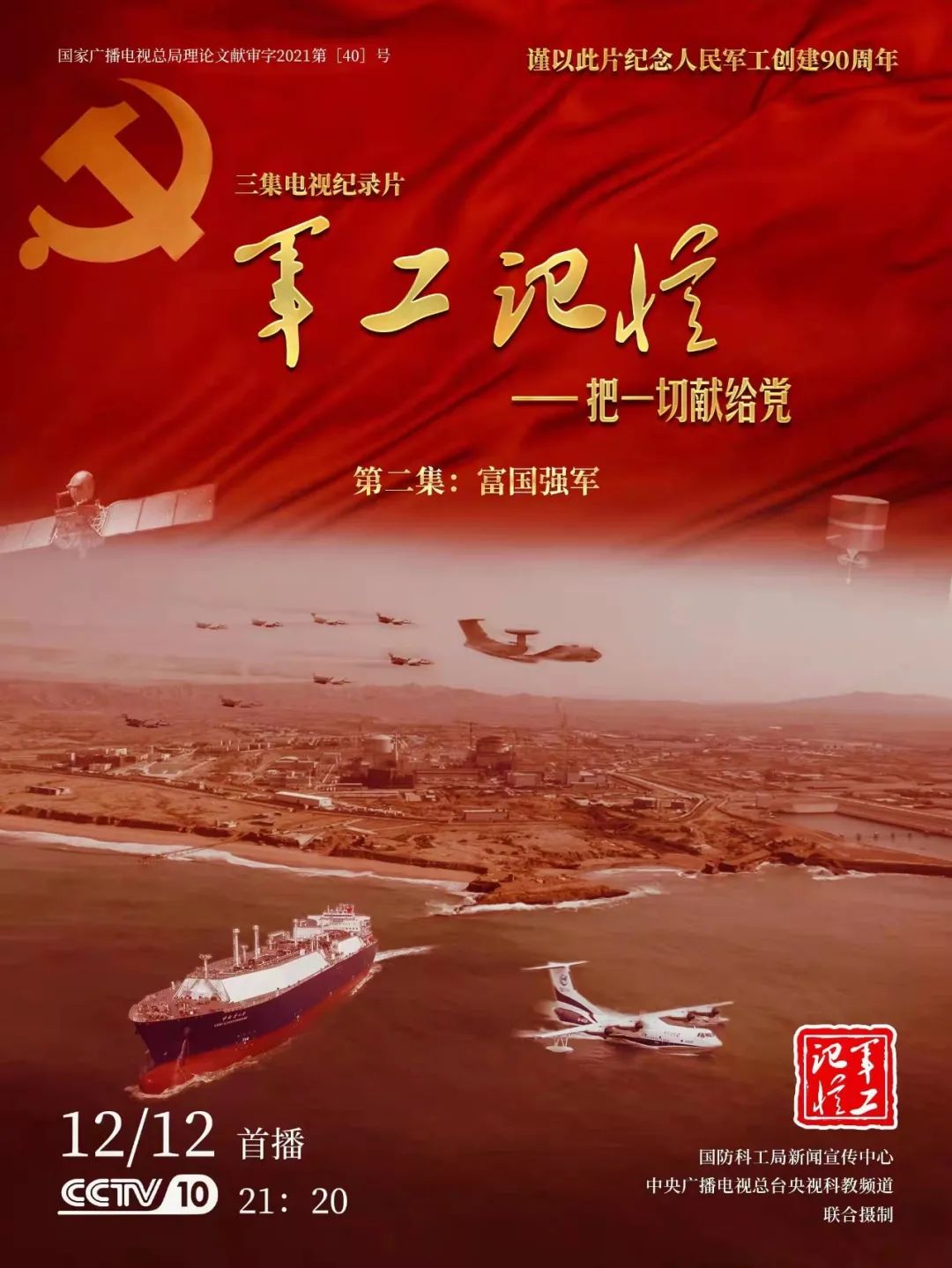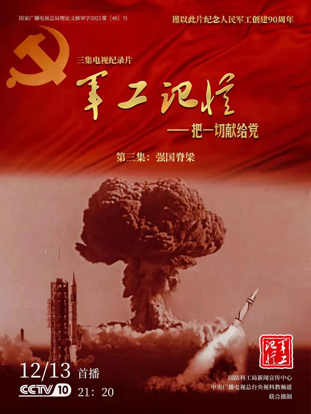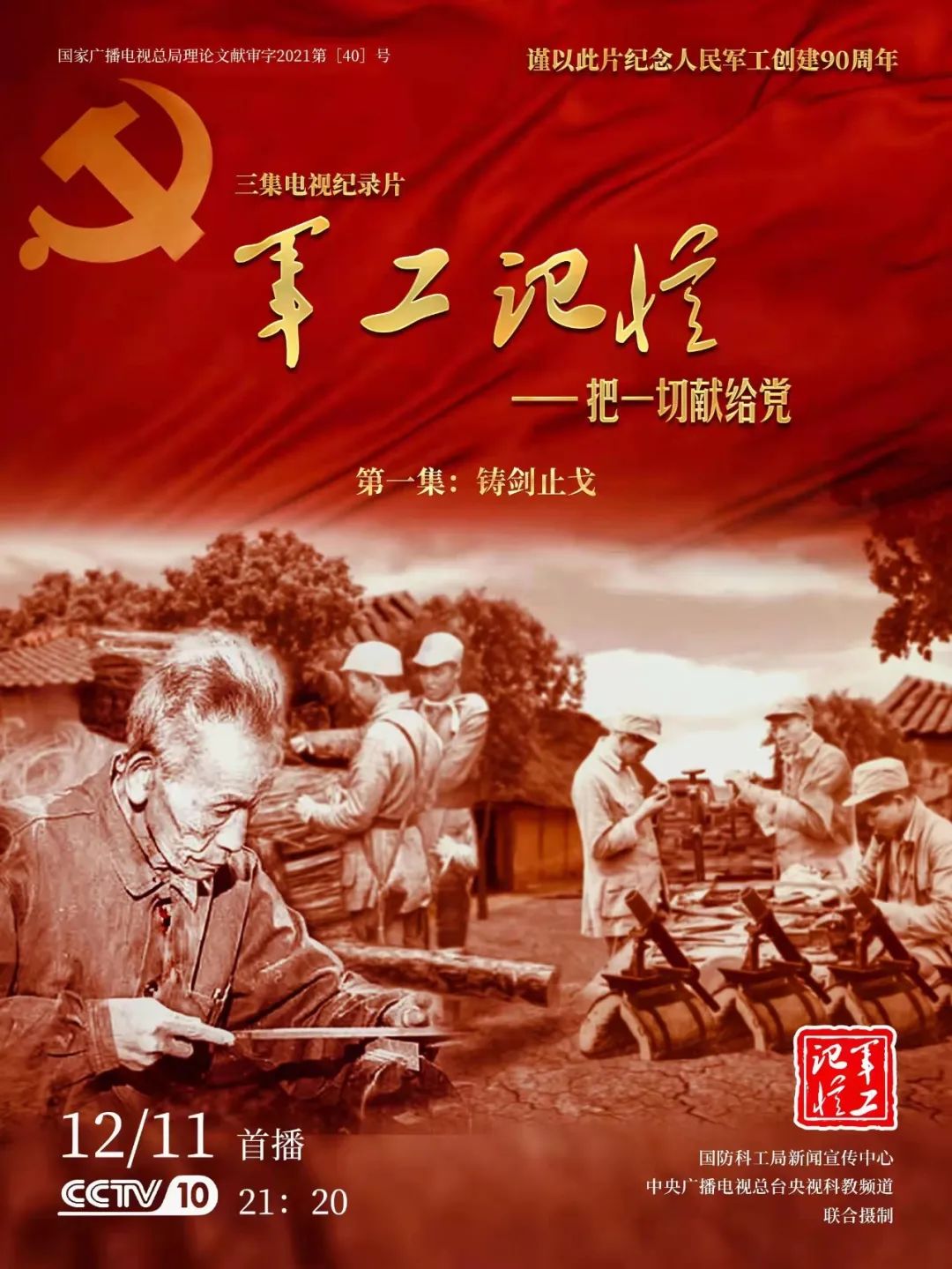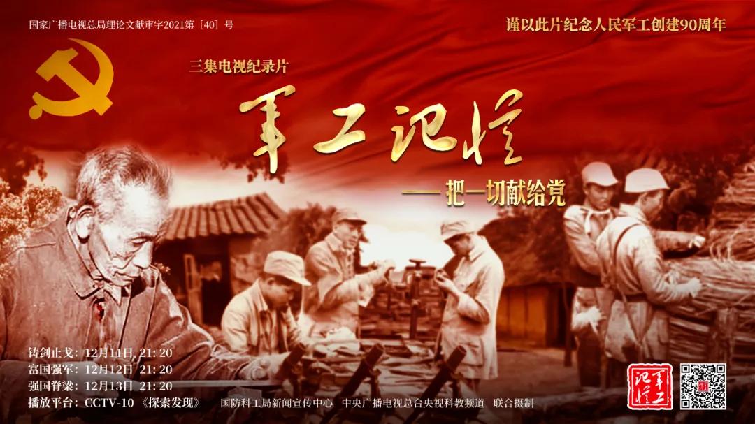 為慶祝中國共產(chǎn)黨成立100周年,紀(jì)念黨領(lǐng)導(dǎo)下的人民軍工創(chuàng)建90周年,由國防科工局指導(dǎo),國防科工局新聞宣傳中心聯(lián)合中央廣播電視總臺社教節(jié)目中心攝制,各軍工集團大力支持的3集重大理論文獻電視紀(jì)錄片《軍工記憶——把一切獻給黨》,將于12月11日21:20在央視科教頻道(CCTV-10)《探索發(fā)現(xiàn)》欄目首播,連續(xù)播出3天。該紀(jì)錄片旨在向建黨百年獻禮,向人民軍工90周年致敬,向全社會弘揚軍工精神傳遞軍工文化,激勵國防科技工業(yè)戰(zhàn)線廣大干部職工不忘初心、接續(xù)奮斗,為實現(xiàn)強軍強國夢想貢獻力量。