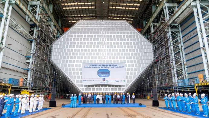 VLEC建造團(tuán)隊在船東、配套廠商和船級社等各方密切配合下,共同克服新冠肺炎疫情等不利因素,攻克B型液貨艙核心關(guān)鍵技術(shù)難點,注重項目管理導(dǎo)向、革新工藝工法、鎳鋼焊接程序、薄板變形控制和優(yōu)化建造流程。從2019年12月底合同簽約到今天首制船的完工交付,總建造周期24個月,碼頭舾裝周期4個月,均開創(chuàng)了江南造船大型液化氣船首制船最短周期紀(jì)錄,實現(xiàn)了復(fù)雜船型節(jié)拍化建造。