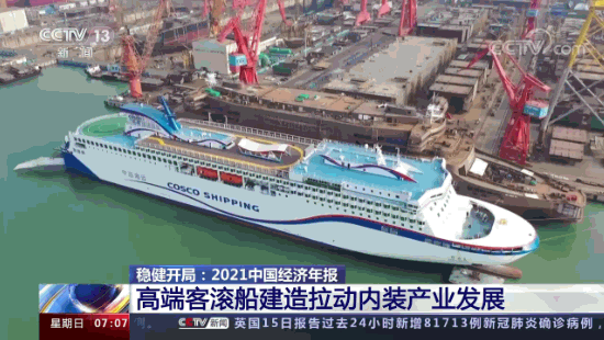 這里是中國船舶廣船國際的造船碼頭,多艘大型豪華客滾船正在緊張調(diào)試和建造。負責(zé)人告訴記者,2021年,像這樣的高端客滾船他們廠一共建造完工了5艘,產(chǎn)值占比達到約40%。