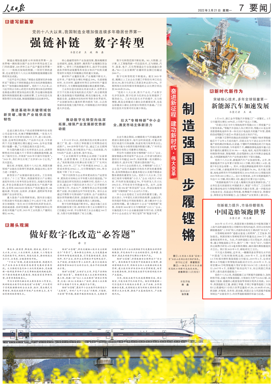 黨的十八大以來,我國(guó)船舶工業(yè)不斷提升創(chuàng)新能力、加快轉(zhuǎn)型升級(jí),在超大型集裝箱船、大型液化天然氣(LNG)船、高端海工裝備、船舶核心配套裝備等領(lǐng)域?qū)崿F(xiàn)多點(diǎn)突破。2021年,我國(guó)造船完工量、新接訂單量、手持訂單量等造船三大指標(biāo)(以載重噸計(jì))分別占世界總量的47.2%、53.8%和47.6%。抓創(chuàng)新、補(bǔ)短板、優(yōu)布局、謀高端,我國(guó)正全力鞏固提升船舶領(lǐng)域全產(chǎn)業(yè)鏈競(jìng)爭(zhēng)力,向世界造船強(qiáng)國(guó)目標(biāo)奮力邁進(jìn)。