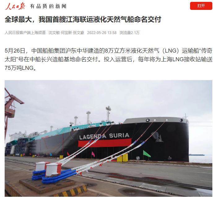 “傳奇太陽”號是滬東中華自4月25日復工復產以來交付的第二艘船,投入運營后,每年將為上海LNG接收站輸送75萬噸LNG。另悉,2號船計劃于下個月交付,屆時“姊妹船”聯(lián)袂為上海社會經濟發(fā)展、清潔能源保供和綠色產業(yè)振興將發(fā)揮重要作用。