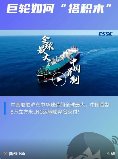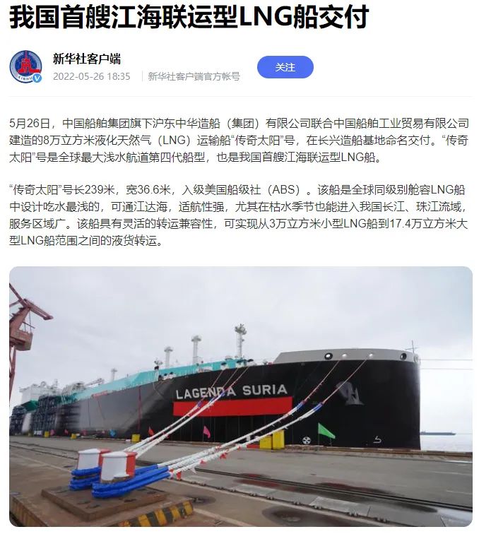 5月26日,中國船舶集團旗下滬東中華聯(lián)合中船貿易建造的8萬立方米液化天然氣(LNG)運輸船“傳奇太陽”號在長興造船基地命名交付?!皞髌嫣枴碧柺侨蜃畲鬁\水航道第四代、我國首款首制首艘江海聯(lián)運型LNG船,填補了中國淺水航道LNG船的空白,在該細分市場占有率最高,有望成為中國船舶制造的又一精品船型。