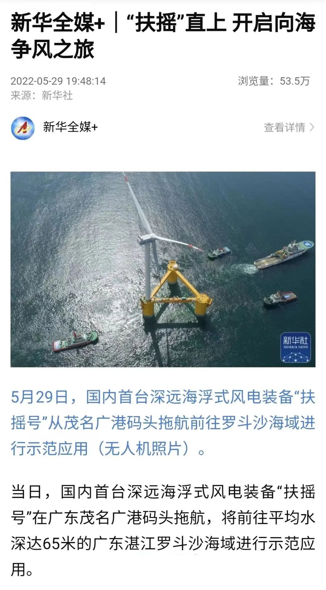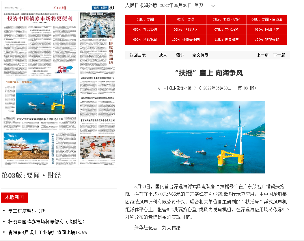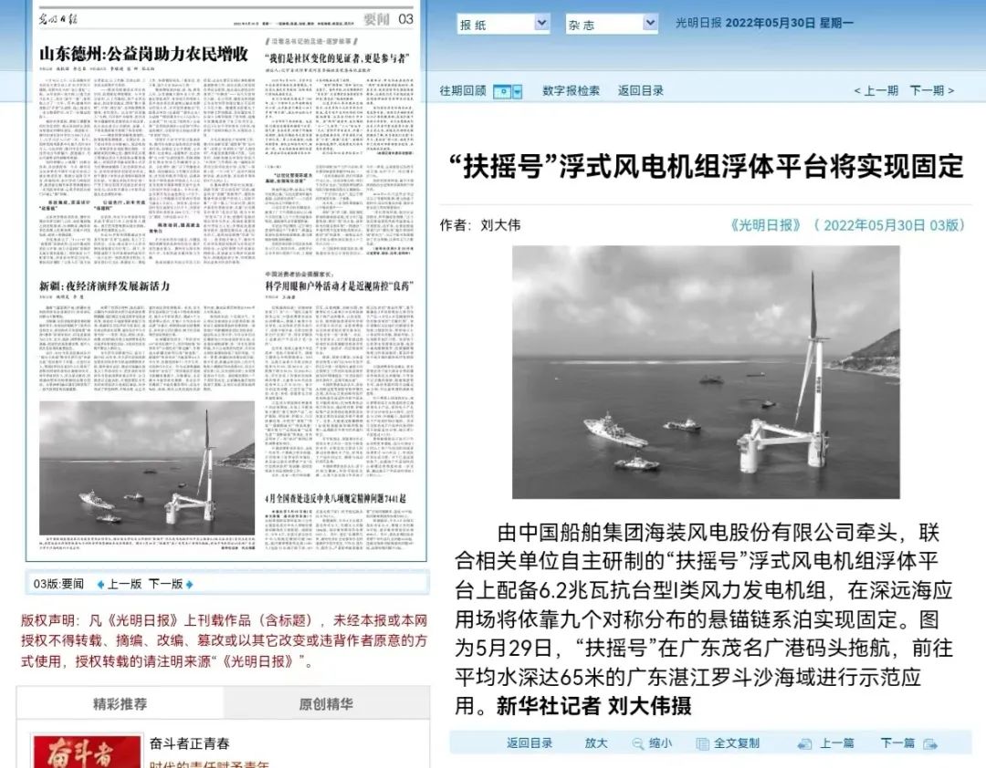 5月29日,中國船舶集團(tuán)旗下中國海裝牽頭研制的國內(nèi)首臺深遠(yuǎn)海浮式風(fēng)電裝備——“扶搖號”從廣東茂名碼頭起航,前往平均水深65米的廣東湛江附近海域投入示范應(yīng)用。
