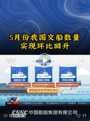 6月15日,中國(guó)船舶工業(yè)行業(yè)協(xié)會(huì)公布了今年前五個(gè)月我國(guó)船舶工業(yè)的運(yùn)行數(shù)據(jù)。數(shù)據(jù)顯示,今年前五個(gè)月,我國(guó)船舶工業(yè)生產(chǎn)經(jīng)營(yíng)逐步企穩(wěn)回升。五月份,交船數(shù)量實(shí)現(xiàn)環(huán)比回升。