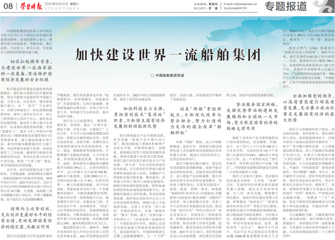 6月22日,《學(xué)習(xí)時報》發(fā)表中國船舶集團(tuán)黨組署名文章《加快建設(shè)世界一流船舶集團(tuán)》,萬山磅礴看主峰,大潮奔涌好揚帆,面向新征程,中國船舶集團(tuán)將踔厲奮發(fā)、勇毅前行,為發(fā)展壯大國有經(jīng)濟(jì)貢獻(xiàn)更大力量,以優(yōu)異成績迎接黨的二十大勝利召開。