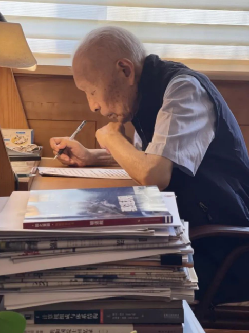 我是記者江曉晨。92歲的潘鏡芙左眼幾乎失去了感光能力,他把工作臺(tái)放在陽(yáng)臺(tái),這里采光好,方便他讀書寫字。下午的陽(yáng)光透過(guò)玻璃,打在書本上。潘鏡芙向前探著身,平靜而專注,大約他還想離書本更近一些,看得再仔細(xì)一些,這樣才能趕上不斷移行的陽(yáng)光,趕上嘀嗒疾走的時(shí)間。