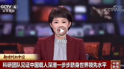 系列報道《新時代的中國》之《科研團隊見證中國載人深潛一步步躋身世界領(lǐng)先水平》,于9月25日在央視中文國際頻道《中國新聞》欄目和《今日環(huán)球》欄目面向全球播出。
