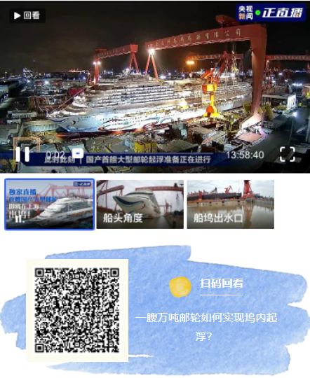 目前,船塢注水已經(jīng)結(jié)束,郵輪已經(jīng)起浮,將相繼實現(xiàn)起浮、移塢和出塢,您也可以掃描下方圖片中二維碼,一鍵直達直播現(xiàn)場。