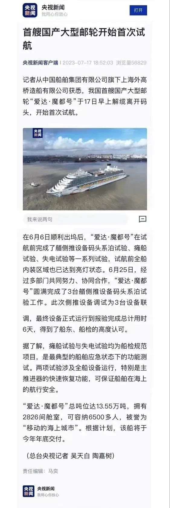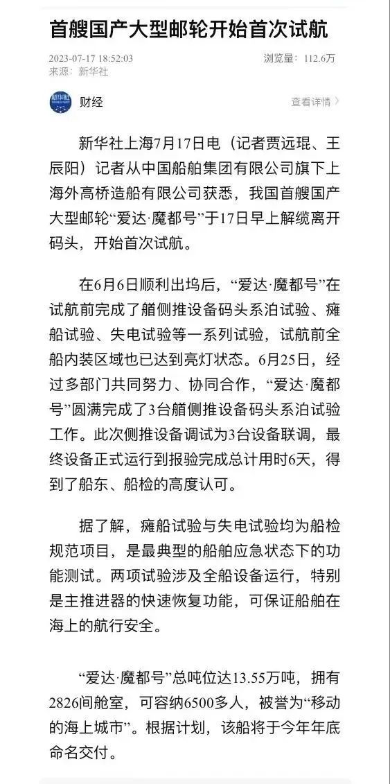 國(guó)產(chǎn)首制大型郵輪試航