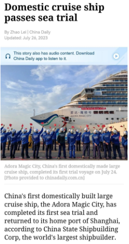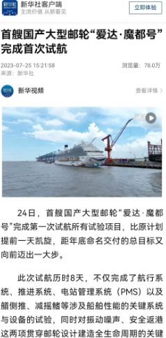 7月24日晚,首艘國產(chǎn)大型郵輪“愛達·魔都號”完成第一次試航所有試驗項目比原計劃提前一天凱旋,人民日報、新華社、中央電視臺等中央主流媒體進行了報道。