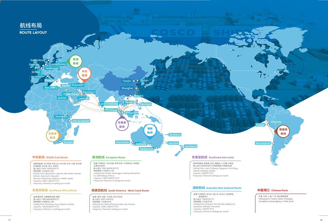 根據(jù)客戶需求,中遠海運協(xié)同船隊與港口優(yōu)化航線設置和運力配置,靈活調(diào)整全球航線布局,開通中東波斯灣、東南亞、歐洲、墨西哥、中南美洲、非洲等班輪航線,為客戶定制商品車運輸整體解決方案,提供多船型、全程端到端物流服務。