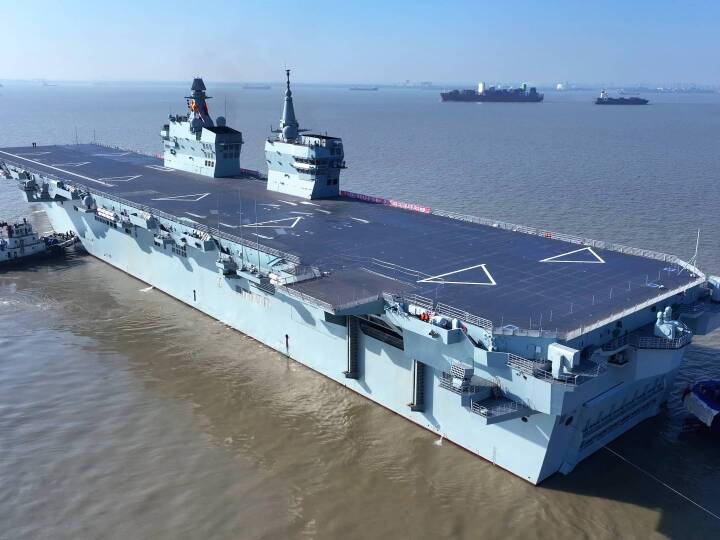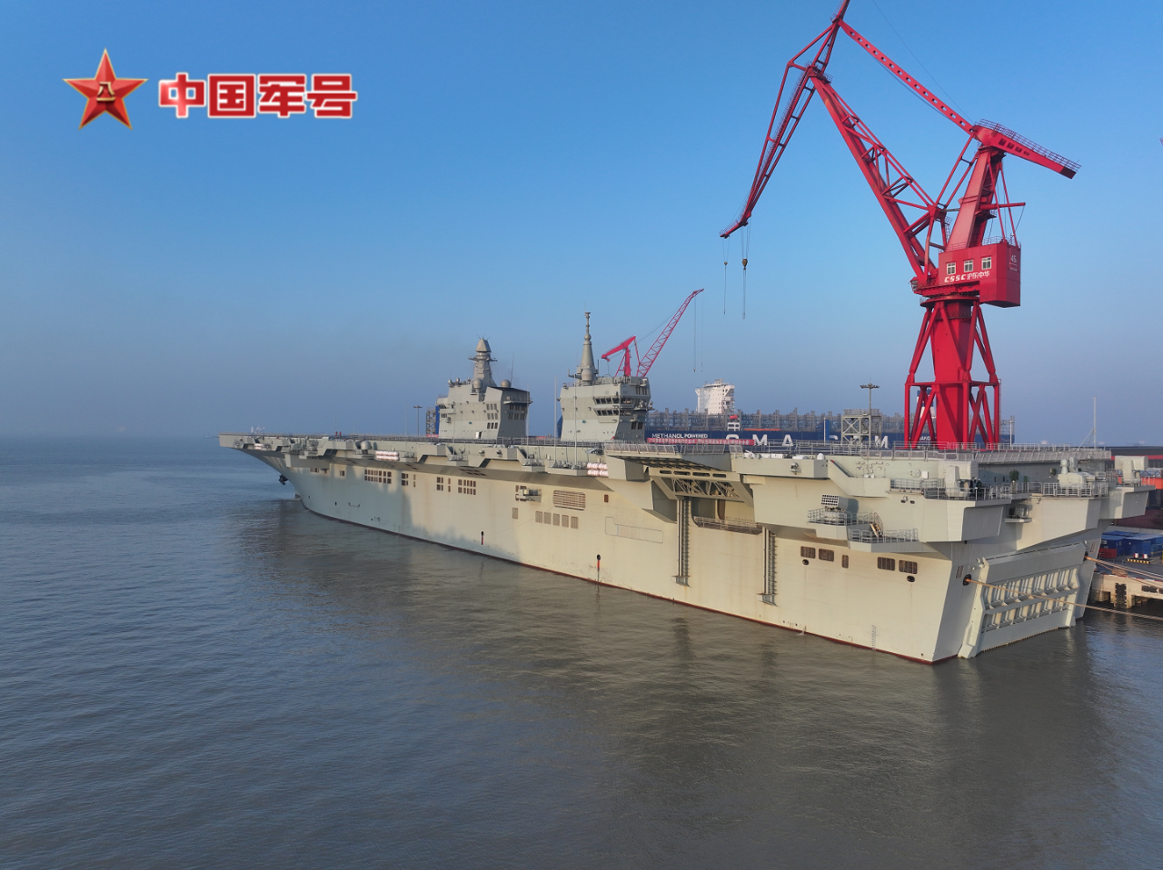 在五艘拖船的牽引下,四川艦離開滬東中華造船廠碼頭駛向相關海域。四川艦舷號為51,是海軍新一代兩棲攻擊艦,滿載排水量4萬余噸,設置雙艦島式上層建筑和全縱通飛行甲板,創(chuàng)新應用電磁彈射和阻攔技術,可搭載固定翼飛機、直升機、兩棲裝備等。