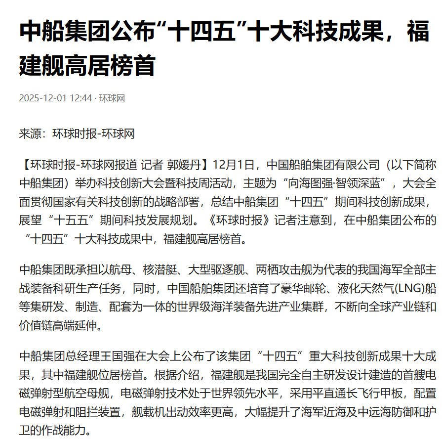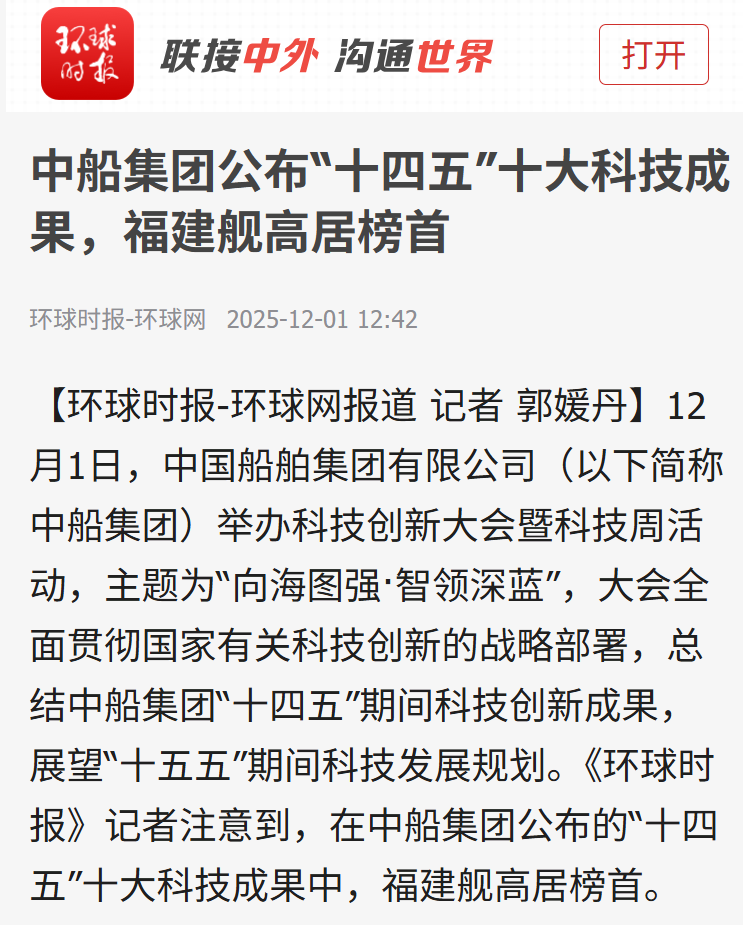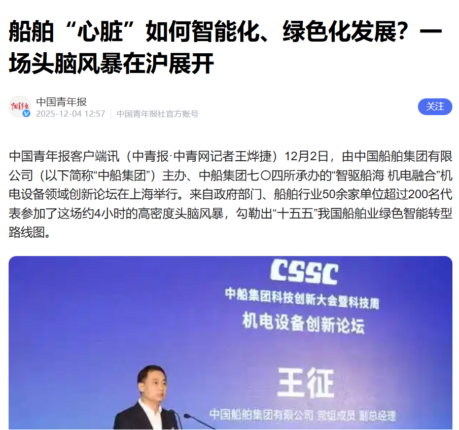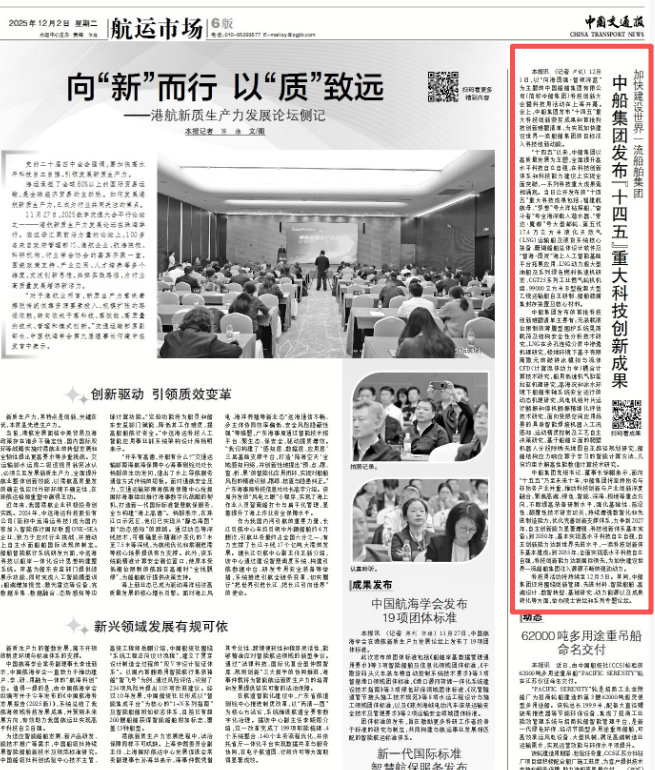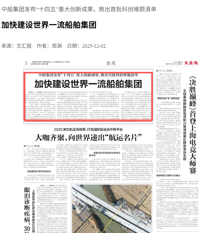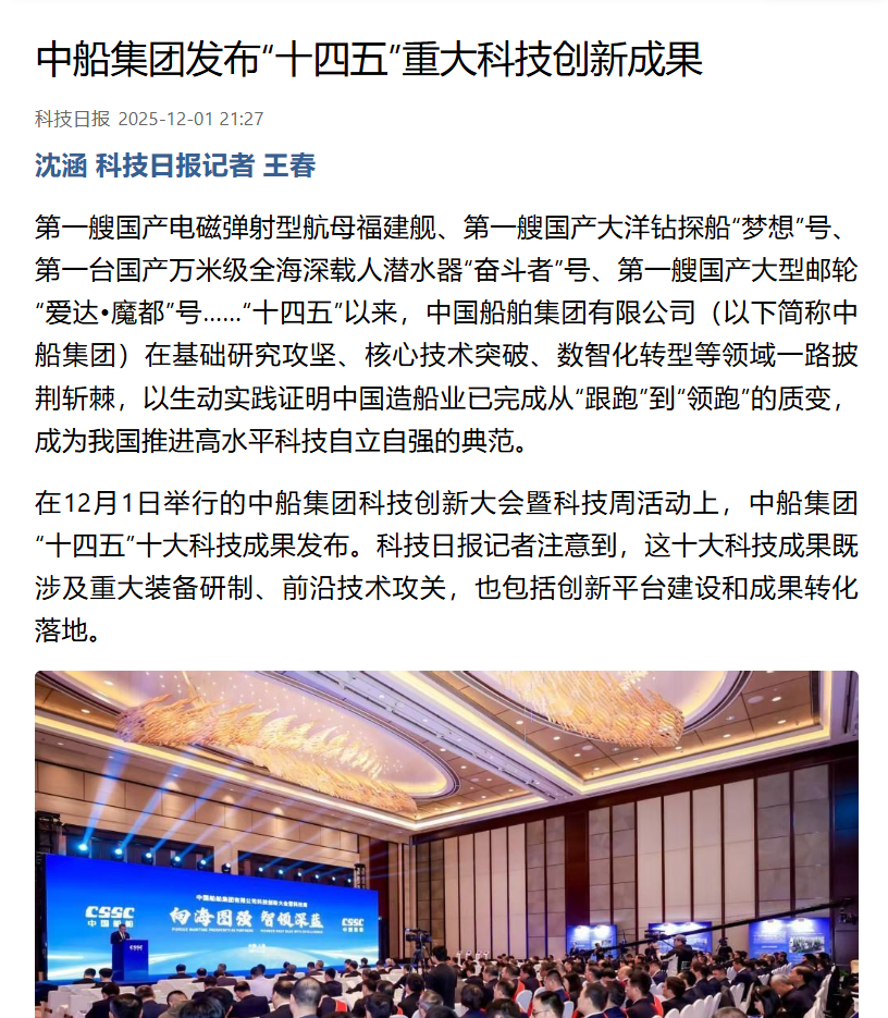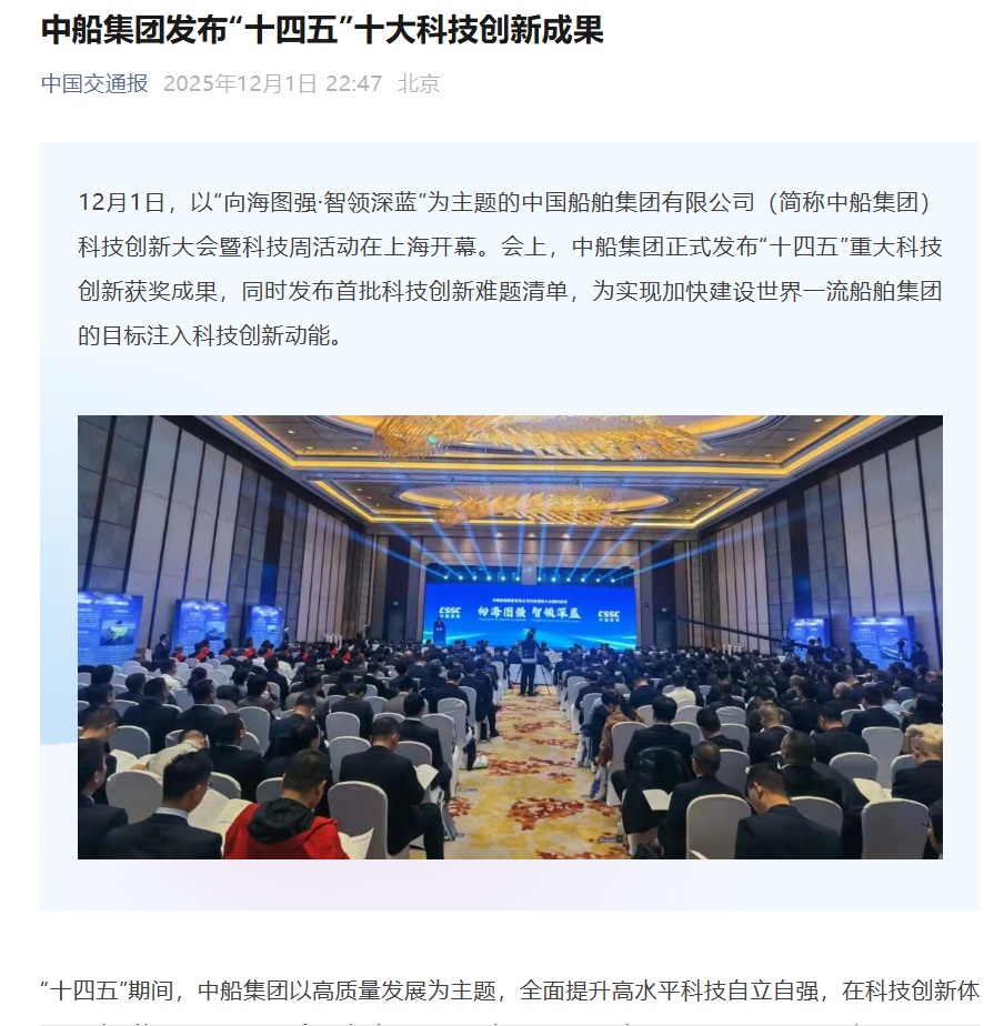 此次大會(huì)聚焦“向海圖強(qiáng)·智領(lǐng)深藍(lán)”主題,系統(tǒng)總結(jié)了中船集團(tuán)“十四五”期間科技創(chuàng)新工作及重大科技創(chuàng)新成果,謀劃“十五五”科技發(fā)展規(guī)劃,引發(fā)中央、行業(yè)及地方媒體的廣泛關(guān)注報(bào)道。