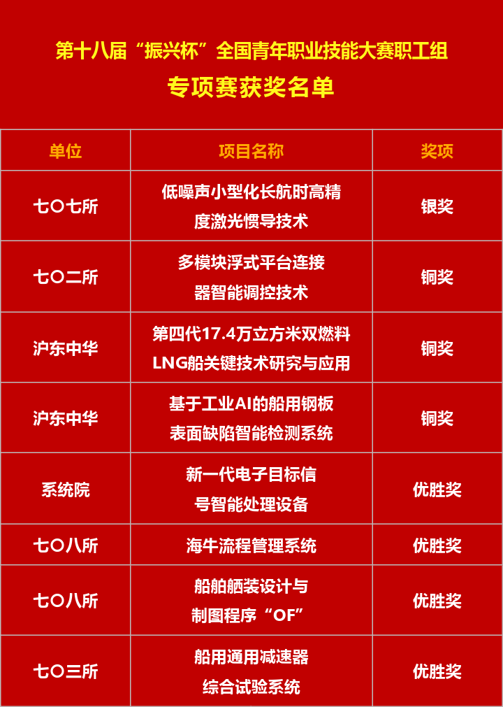 11月15日,第十八屆“振興杯”全國青年職業(yè)技能大賽職工組全國決賽在沈陽落下帷幕,中國船舶集團(tuán)青年取得主體賽(職業(yè)技能競賽)“1銀2銅7優(yōu)勝獎(jiǎng)”、專項(xiàng)賽(創(chuàng)新創(chuàng)效競賽)“1銀3銅4優(yōu)勝獎(jiǎng)”的好成績。其中,黃埔文沖吳道升、七〇七所“低噪聲小型化長航時(shí)高精度激光慣導(dǎo)技術(shù)”項(xiàng)目分獲銀獎(jiǎng),在“青春競技場”上展現(xiàn)了船舶青年的自信卓越風(fēng)采。