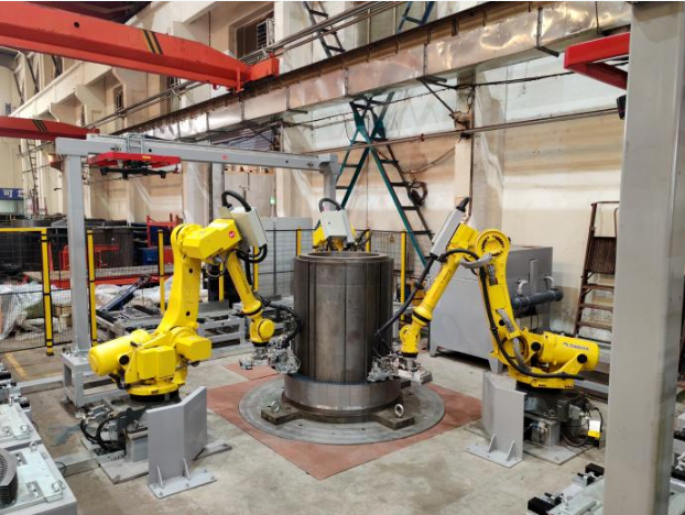 近日,中國船舶集團旗下杰瑞自動化承研的定子鐵芯疊裝機器人工作站項目通過驗收并投入使用,實現(xiàn)了大型高壓異步電機關(guān)鍵配套——定子鐵芯的自動化生產(chǎn)。